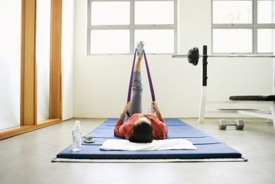 برای انجام این تمرین به پشت بر روی پد بدنسازی یا سطح نرمی دراز بکشید و تیوب یا کش بدنسازی را از زیر کف یکی از پاهای خود عبور داده و دو سر آن را با دو دستان خود بگیرید .
